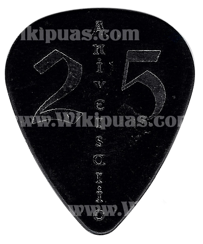 Tras el parón de 2012 y Mägo de Oz volvió en el año 2013 con nueva formación (cantante, bajista, teclados, flautas…) y nuevo disco: Hechizos, pócimas y brujería. La gira duró dos años (2013-2014) y durante ese tiempo, en 2014 se cumplió el 25 aniversario de la banda. Se hicieron dos púas con el logo del 25 aniversario por la cara trasera (una para Frank y otra para Carlitos), así como otras dos púas sin nada por detrás, una blanca y otra negra, para Frank. Por su parte Fernando Mainer, el nuevo bajista, encargó dos modelos diferentes, uno verde con forma de bajo y otro negro con forma de púa normal.