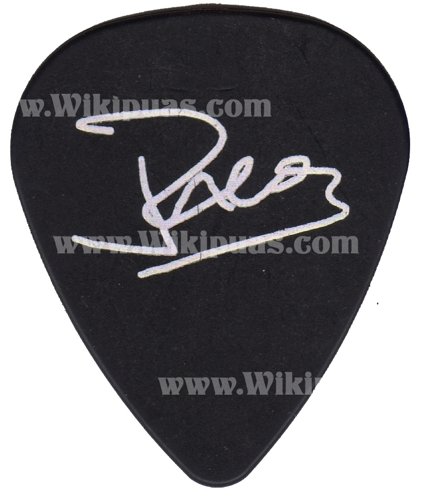 Púa del guitarrista Paco Laguna, del madrileño grupo de rock Obús. Esta púa pertenece a un set de tres iguales, en diferentes colores (rojo, azul, negro) y se empezaron a utilizar en la gira del año 2011.