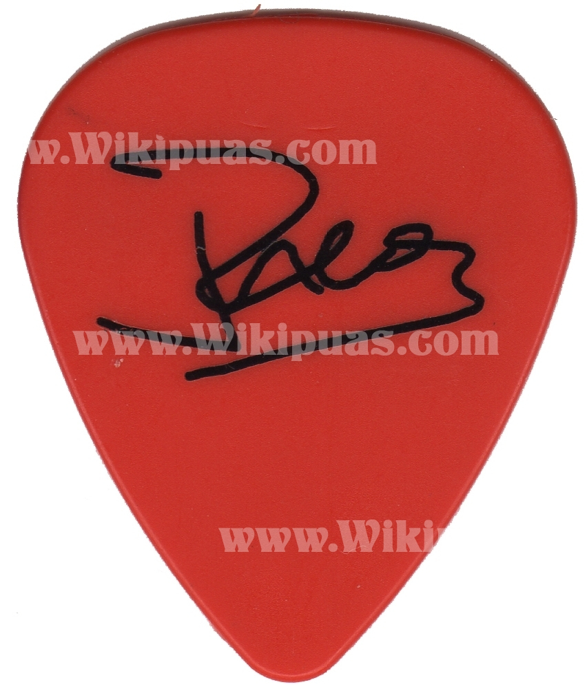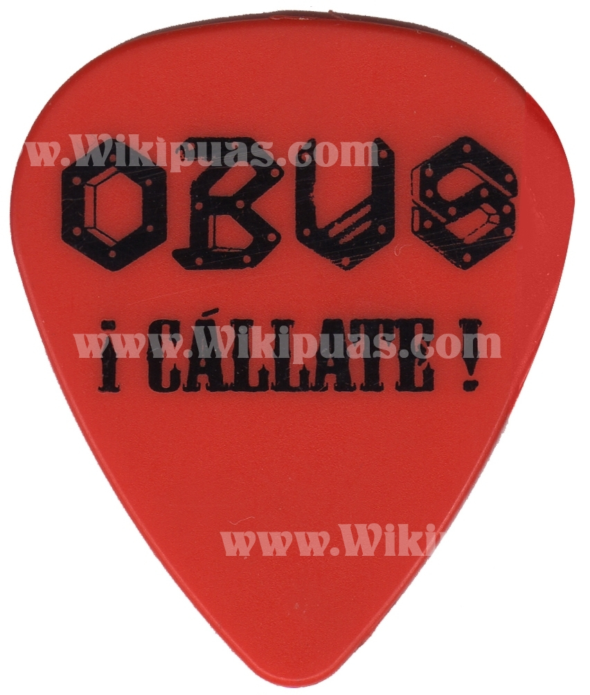 Púa del guitarrista Paco Laguna, del madrileño grupo de rock Obús. Esta púa pertenece a un set de tres iguales, en diferentes colores (rojo, azul, negro) y se empezaron a utilizar en la gira del año 2011.
